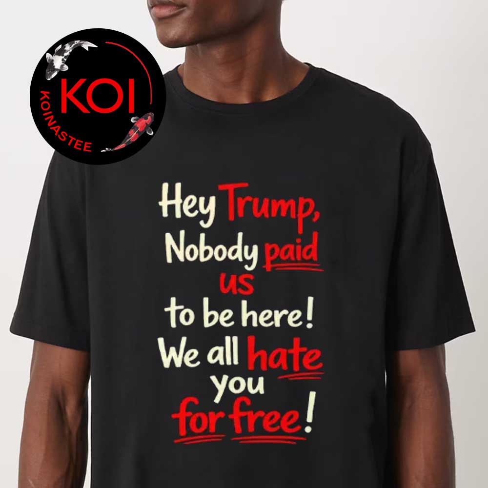 Step into the world of Koinastee, your go-to destination for trendy and expressive fashion inspired by Hey Trump Nobody Paid Us To Be Here We All Hate You For Free Unisex T-Shirt. Explore our diverse collection of premium-quality apparel for men, women, and kids — including t-shirts, hoodies, sweatshirts, long sleeves, tank tops, and inclusive plus-size options. Whether you’re celebrating the holidays, following viral trends, or repping your favorite pop culture icons, our curated designs help you wear what you love with confidence.