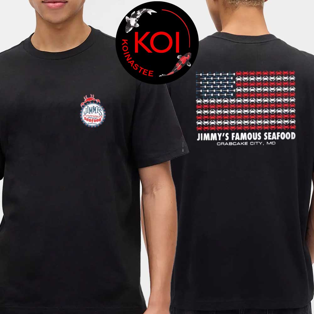 Product Overview: Jimmy’s Famous Seafood Crab Flag America Flag Crabcake City MD Two Sided T-Shirt